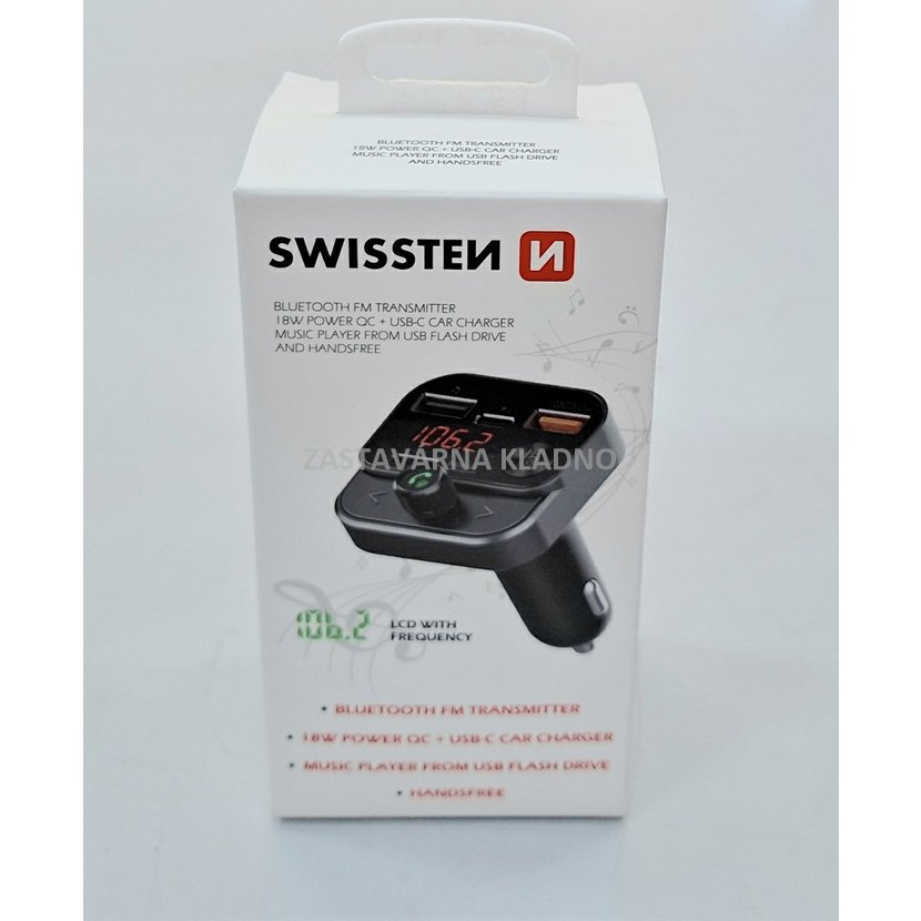 FM vysílač SWISSTEN s přehráváním hudby z flash disku, s hlasitým odposlechem a nabíjecími porty 2xUSB-A a 1x USB-C.